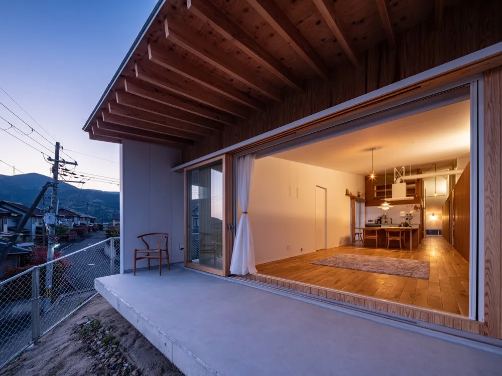 写真1枚目:遠くまで見渡すことのできる大開口には大きな庇を設置しています。