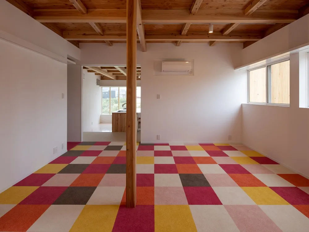 写真:床はタイルカーペット。転んでも怪我をしにくい柔らかくて暖かい材料です。汚れたら外して丸洗いできます。