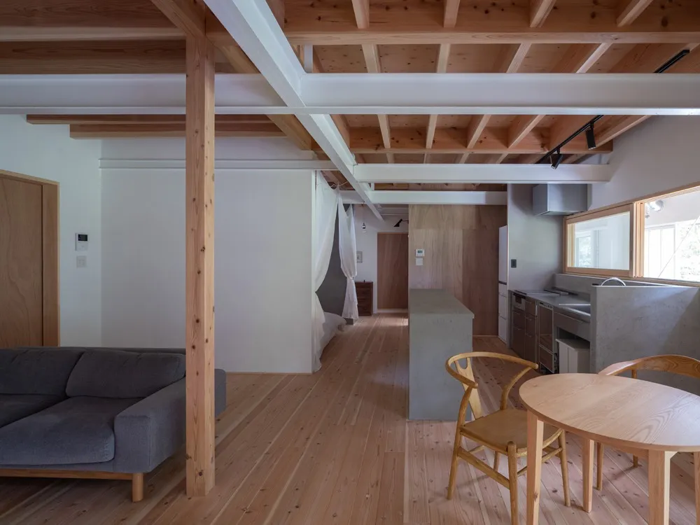 写真2枚目:緩やかにずれて配置された居間、台所、寝室はつながりながらも独立した空間となっています。